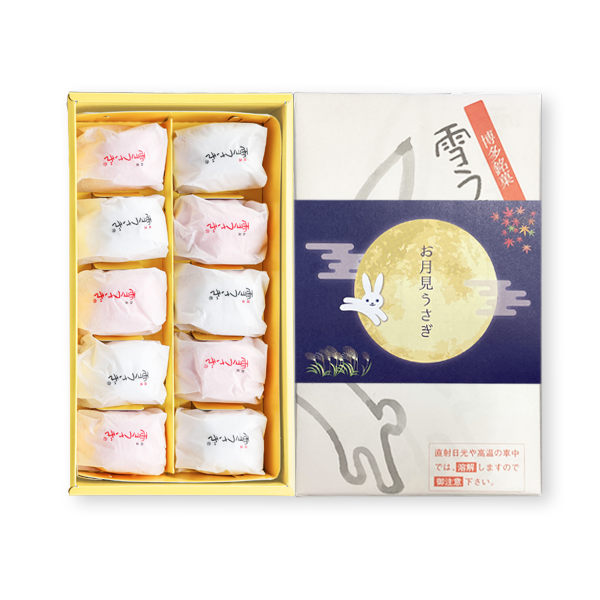 紅白の雪うさぎを5個ずつ詰め合わせた10個入り箱に